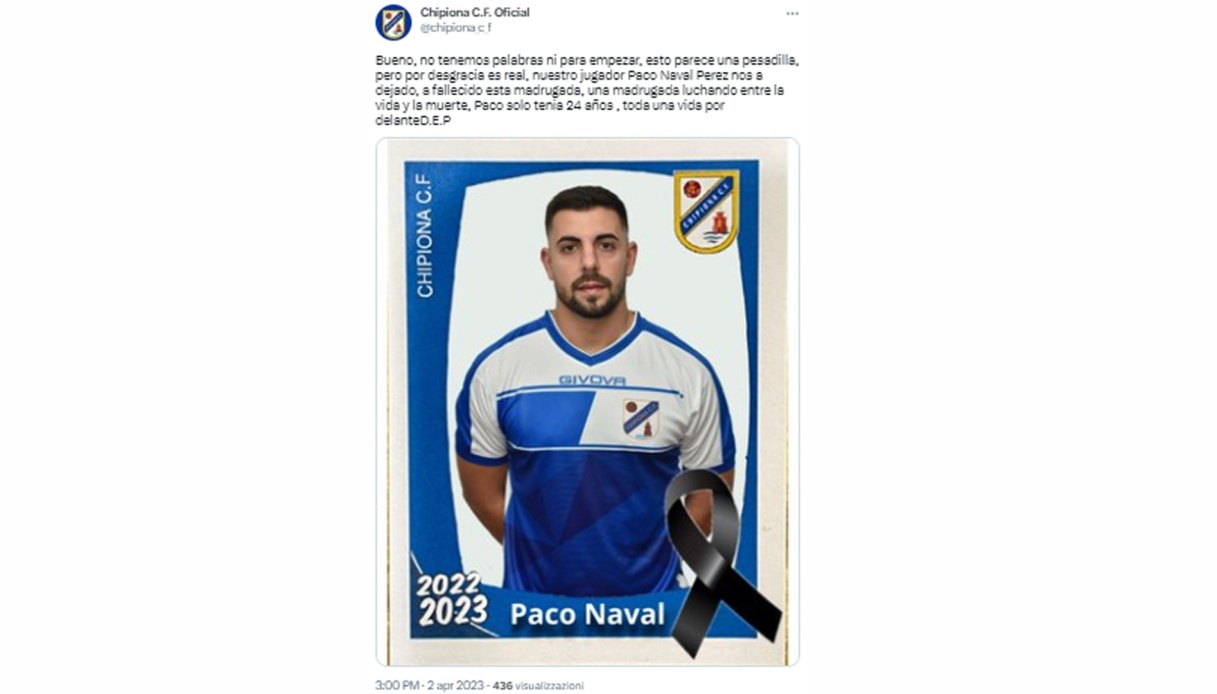 A new terrible tragedy has struck Spanish soccer. Paco Naval Perez, a soccer player on the strength of Chipiona, a team participating in the Segunda Andaluza Sénior championship, was killed with a stab wound to his chest. The boy, 24, was the victim of the heinous act of a 20-year-old, according to reports in the Iberian press, which also speaks of an arrest that has already taken place.