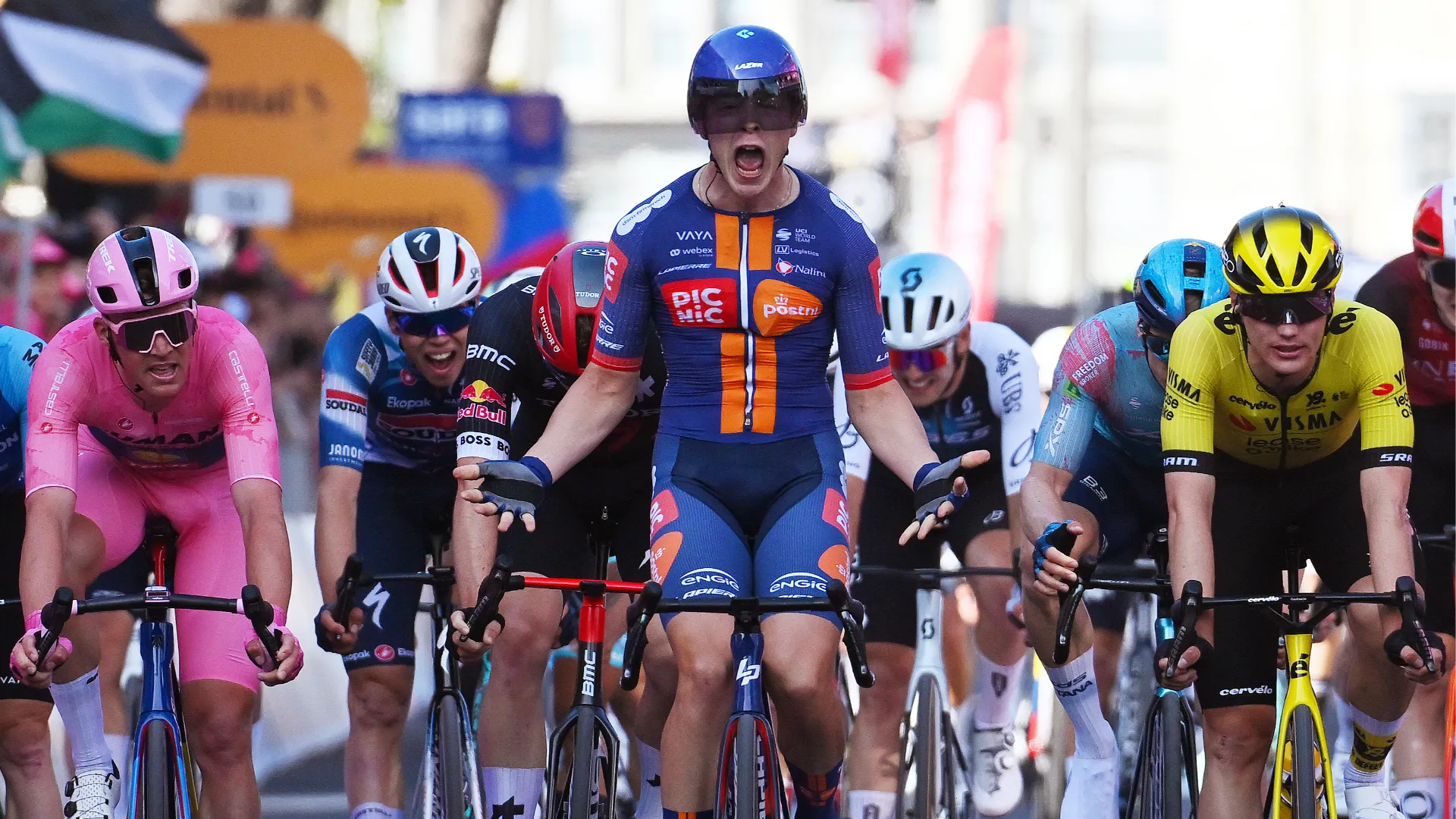 Solo quarto posto per Mads Pedersen (Lidl-Trek) che resta comunque in maglia rosa di leader della classifica generale, con un vantaggio di 7 secondi su Primoz Roglic (Red Bull – Bora – Hansgrohe) e 14 su Mathias Vacek (Lidl-Trek).