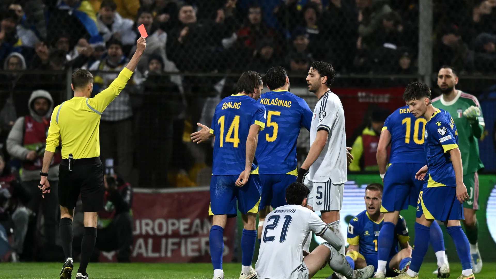 Italy down to 10 men from 42′ of the first half of the World Cup play-off with Bosnia-Herzegovina. In Zenica, there was an icy shower for the Azzurri, who were ahead by one goal thanks to Moise Kean’s goal: Memic eluded Gattuso’s defense and Alessandro Bastoni was forced to knock him down at the edge of the area.